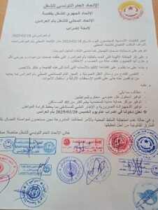 أعلنت النقابات الأساسية التابعة للاتحاد العام التونسي للشغل المجتمعة أمس الثلاثاء 18 فيفري 2025، تنفيذ إضراب عام بأم العرايس غدا الخميس 20 فيفري.